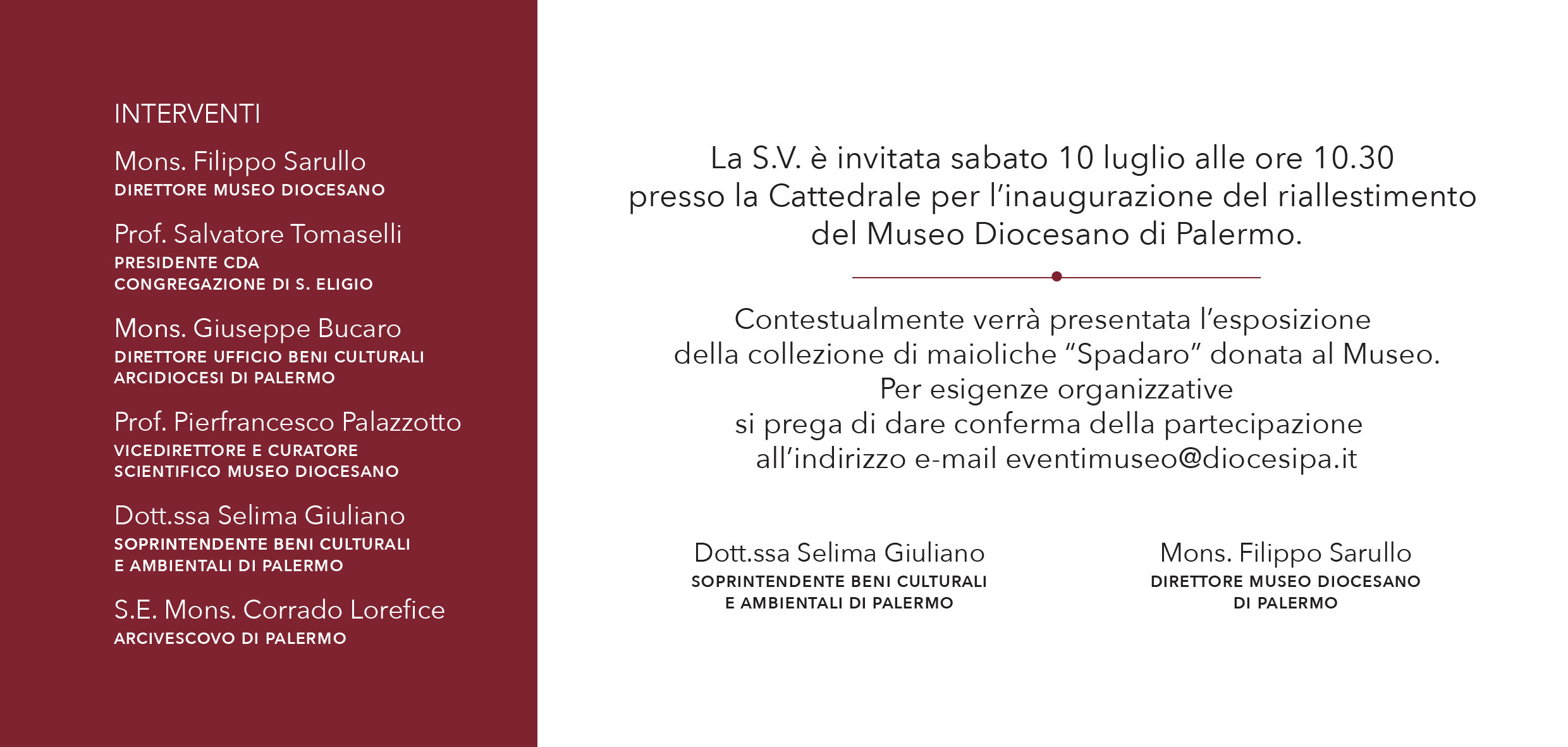 Il Museo Diocesano di Palermo, rinnovato sotto la direzione di Mons. Filippo Sarullo (nominato dall’Arcivescovo Mons. Corrado Lorefice esattamente un anno fa), riapre a distanza di pochi giorni dall’anniversario della sua prima inaugurazione avvenuta il 14 luglio 1927: sabato 10 luglio, alle ore 10:30 presso la Chiesa Cattedrale, avrà luogo l’inaugurazione dell’attuale allestimento. Contestualmente sarà presentata l’esposizione della collezione di maioliche “Spadaro” donata al Museo.